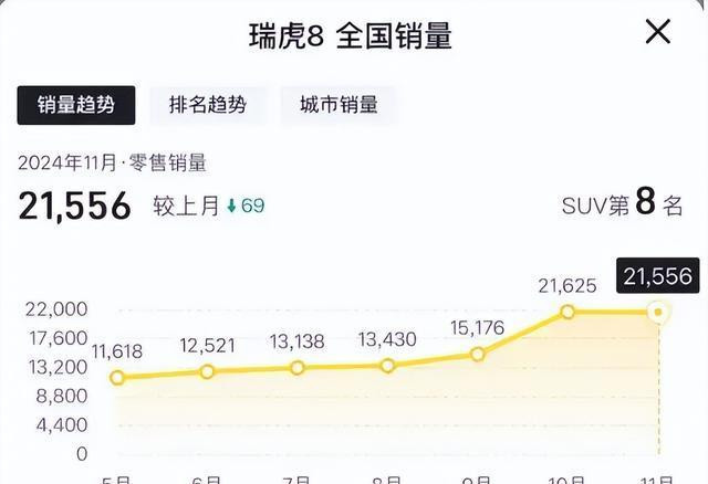 最后,不得不提奇瑞瑞虎 8。对于奇瑞来说,瑞虎 8 一直是绝对的主力车型,但放在 SUV 市场,它之前的表现就比较平淡了,过去两年里月均销量能保持在 1 万辆左右。可从今年 10 月份开始,它的销量开始大涨,10 月、11 月的销量都突破了 2 万辆。